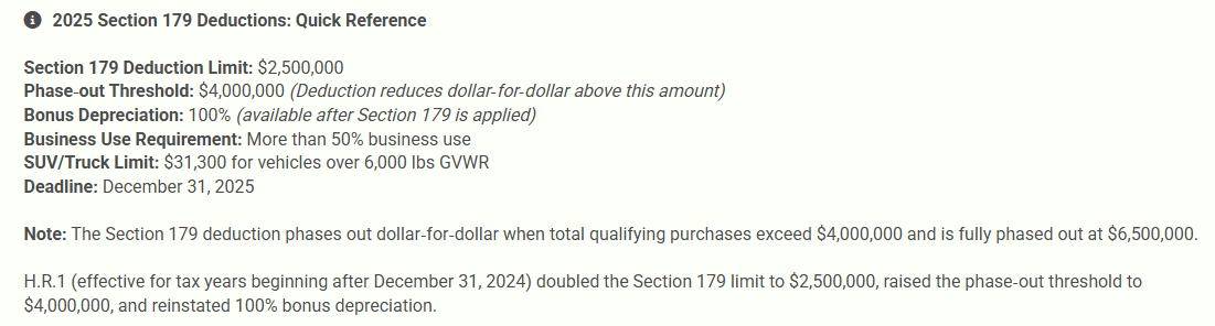 - Bonus Depreciation: After the Section 179 deduction limit has been reached, companies can utilize Bonus Depreciation, immediately deducting 60% of the cost of new or used equipment the year it is placed into service, through 2025.